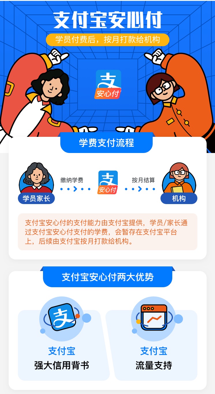 现在该服务已公开面向所有持有营业执照的培训机构开通申请,教培机构在支付宝搜索 “学费码安心付”就可以注册开通。