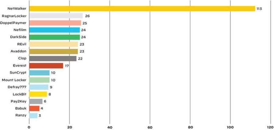 报告显示,2020 年使用最多的勒索软件是 NetWalker,这款软件攻击了 113 家受害企业,并公布了窃取的数据。幸运的是,美国司法部 2021 年 1 月宣布已经联合国际组织瓦解了 NetWalker 犯罪团伙,逮捕了相关人员,关闭了该团伙的网站,没收了资金。