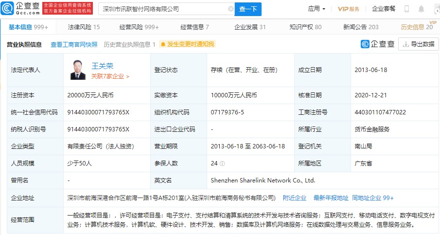 IT之家了解到,讯联智付是一家第三方支付公司,成立于 2013 年,法定代表人为王关荣,注册资本 2 亿元人民币,经营范围包含:电子支付;互联网支付;计算机技术服务;数据库及计算机网络服务;在线数据处理与交易业务、信息服务业务等。