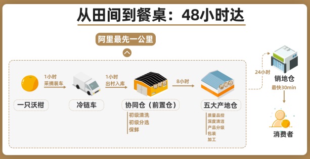 “出村进城”,这是解决农产品 “最先一公里”的核心。2020 年 11 月,全国 5 大阿里巴巴数字农业集运加工中心(产地仓)全部建成并投入使用,分别位于云南昆明、广西南宁、四川成都(蒲江)、山东淄博和陕西西安。据悉,通过稳定的 “产 - 供 - 运 - 销”链路,可以降低 6%-9% 的流通损耗。
