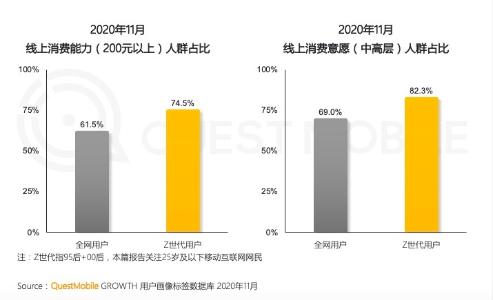 QuestMobile 发布的《2020 “Z 世代”洞察报告》也指出,在移动互联网的高度普及下,Z 世代用户快速增长,用户规模从 2016 年的 1.66 亿翻倍增至 2020 年的 3.25 亿,Z 世代已成为移动网民中的重要组成部分。同时,Z 世代用户优越的生活条件造就了他们更高的消费实力和更强的消费意愿。