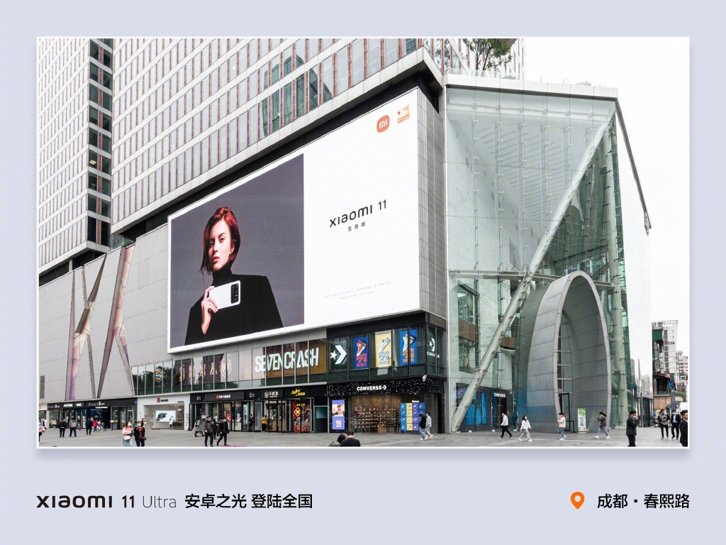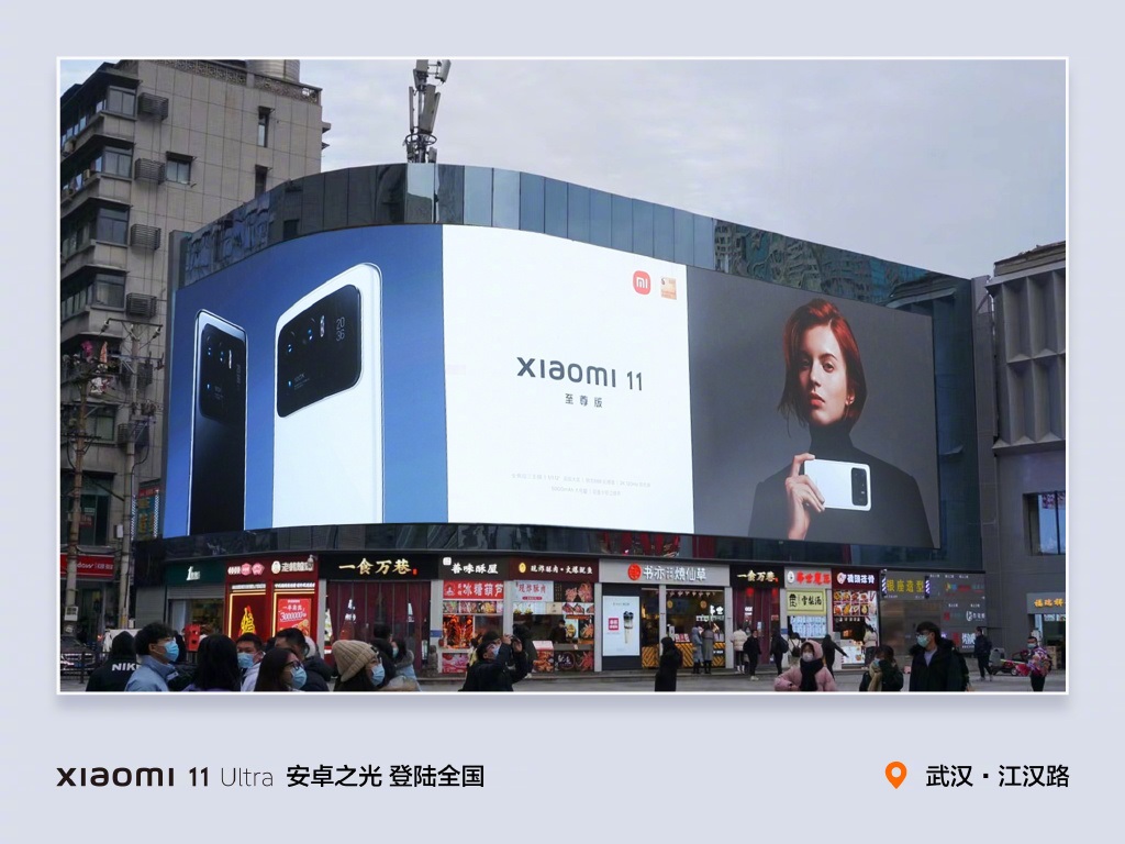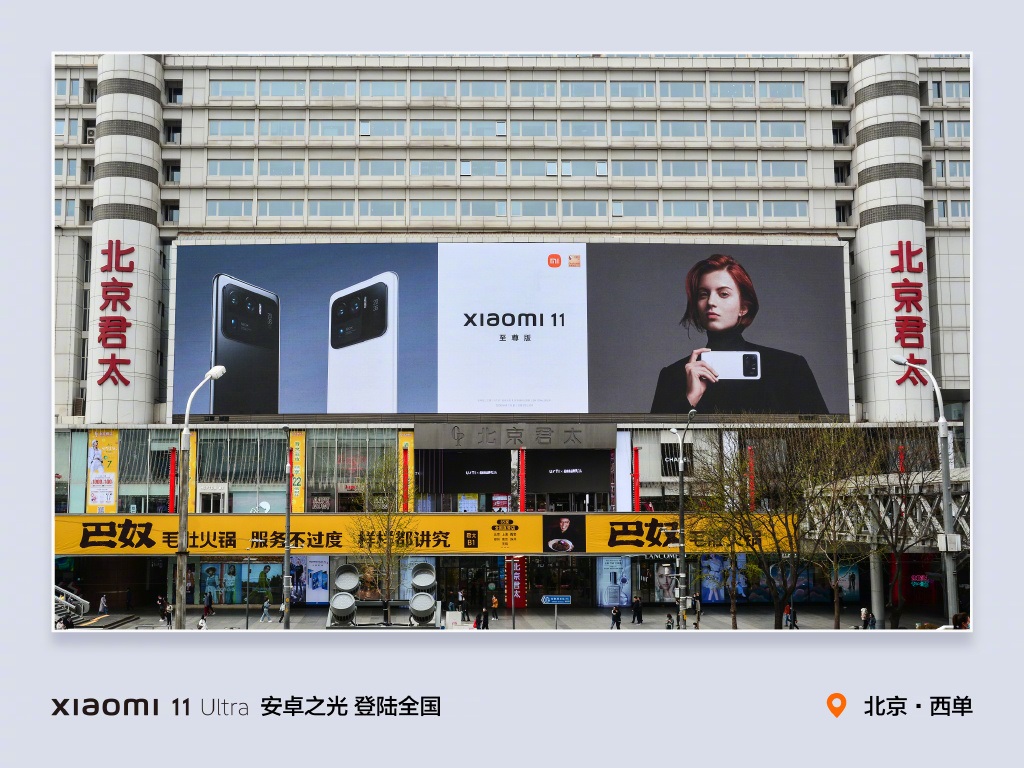 ,4 月 2 日小米 11 Ultra 的户外广告登陆全国 9 座城市中心,包括武汉江汉路、北京西单、成都春熙路、重庆解放碑、南京新街口、上海南京西路、深圳深南大道、沈阳中街、西安南门外。