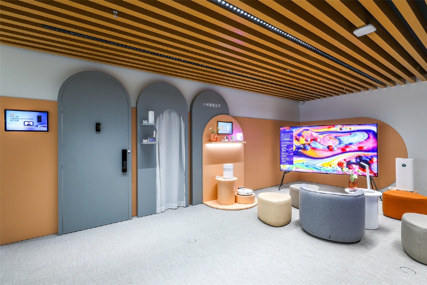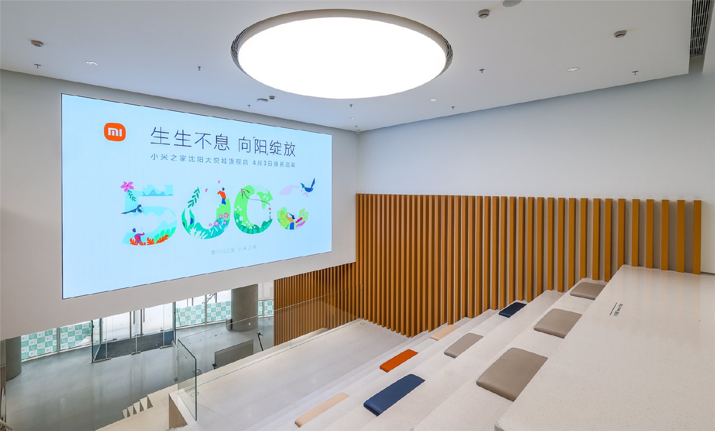 这家店有着大阶梯的设计,正面是一块 LED 屏幕,便于举办活动。二楼的体验区可以试用小米智能家居产品。