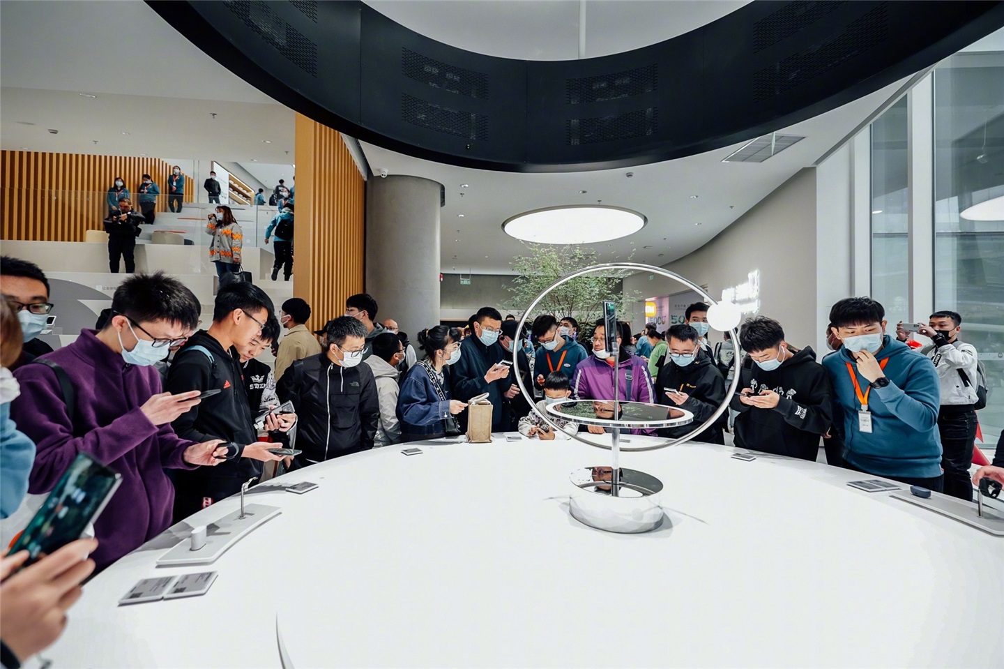 从图中可以看出,这家店采用了圆形的设计语言,中央有着环形展示台,小米 11 Ultra 位于旋转基座上。