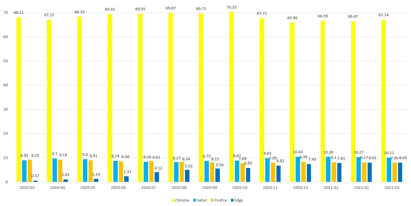 在三月份桌面浏览器市场中,谷歌 Chrome 浏览器仍然是占据霸主地位,份额为 67.14%。根据 StatCounter 的数据,微软 Edge 现在已经超过了火狐,后者目前市场份额为 7.95。Safari 是第二大受欢迎的浏览器,市场份额为 10.11%,Edge 则以 8.03% 的份额稳居第三位,而且几乎每个月都有新用户加入,如下图所示。