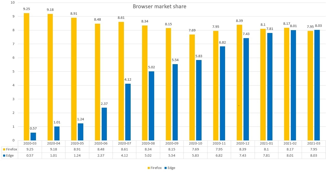 微软 Edge 的额外桌面用户可能来自 Mozilla 的 Firefox。
