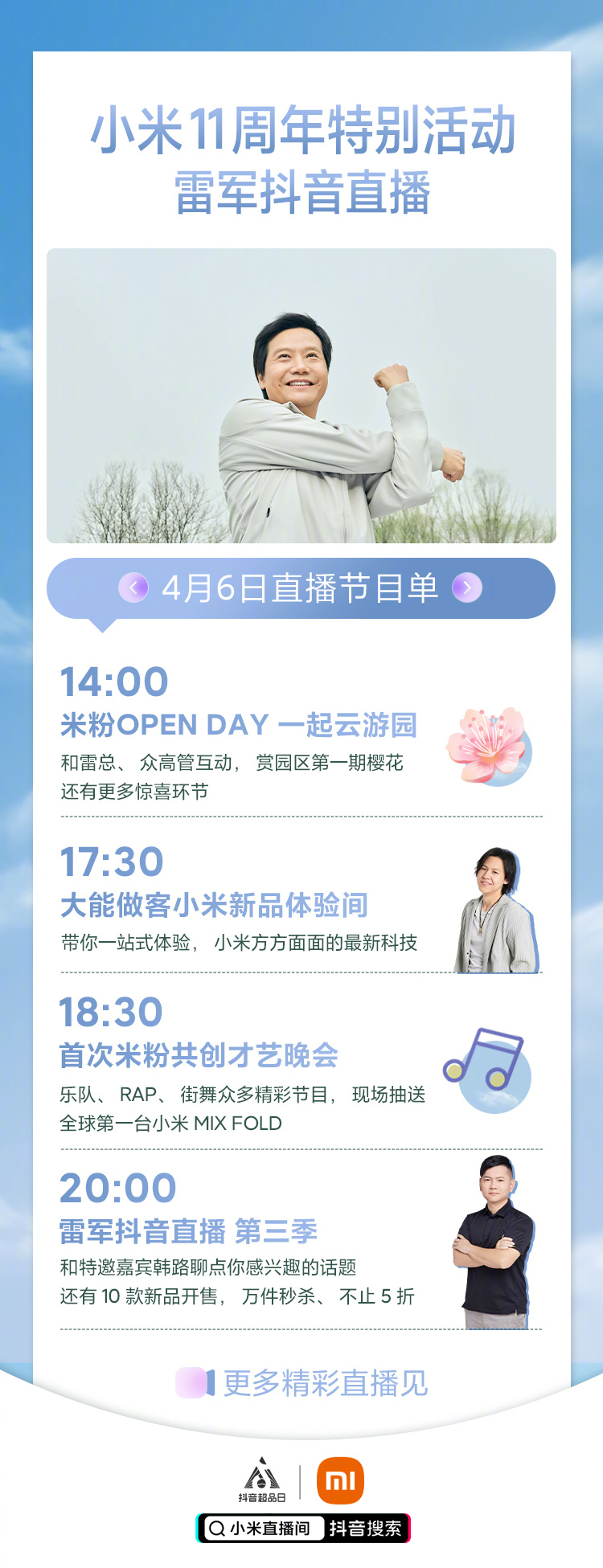 简单来说,14:00 举行米粉 OPEN DAY 游园赏樱;17:30 有大能做客直播间讲述小米黑科技新品;18:30 首次米粉共创才艺晚会,现场抽送全球第一台小米 MIX FOLD;20:00 雷军抖音直播第三季,还有 10 款新品开售。