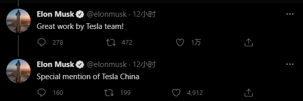 马斯克周一发推称:“特斯拉团队干的非常漂亮。尤其是特斯拉中国的团队!”