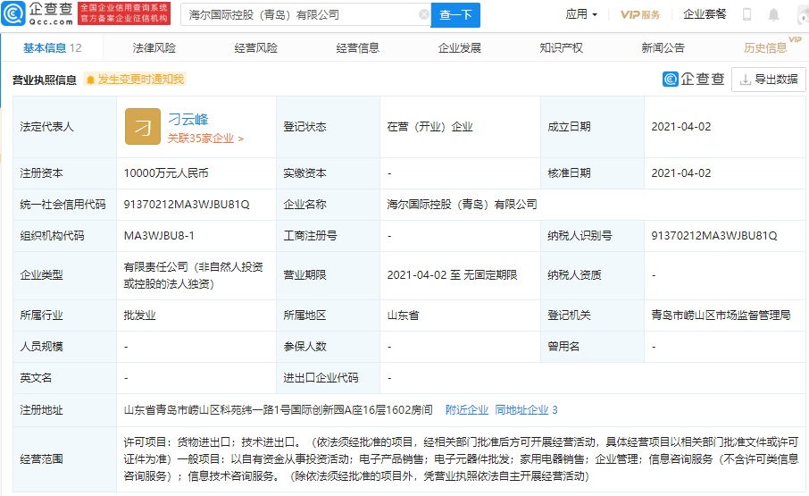 6日消息 企查查 App 显示,4 月 2 日,海尔国际控股(青岛)有限公司成立,法定代表人为刁云峰,注册资本 1 亿元人民币,经营范围包含:货物进出口;技术进出口;以自有资金从事投资活动等。