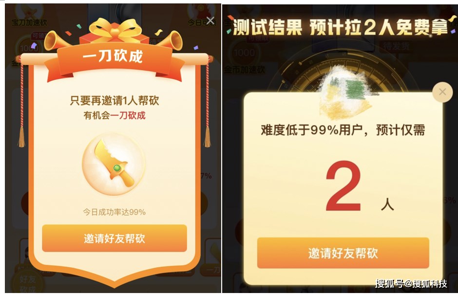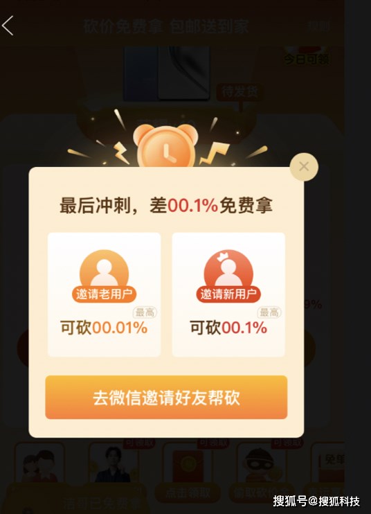 在搜狐科技将砍价口令分享给几名好友并成功砍成后,和上述刘律师的表述类似,此时页面弹窗也同样提示 “预计再邀请 2 人即可免费拿”以及 “只要再邀请 1 人帮砍,有机会一刀砍成”。