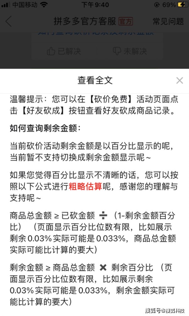 在搜狐科技所做的测试中,由于剩余比例为 0.1%,按照四舍五入原则,剩余比例在 0.05% 和 0.149% 之间,由于已砍金额为 8986.04 元,按照平台给出的商品价值 >= 已砍金额 /(1 - 剩余金额百分比),则该手机需砍总价格在 8990.54 元至 8999.45 元,剩余待砍金额的范围在 4.50 元至 13.41 元之间。