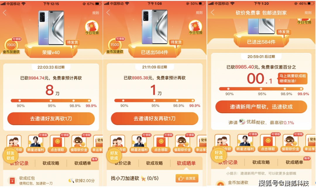 但在继续成功邀请 2 名新用户后,页面弹窗并未显示砍价成功,而是提示 “已经砍掉 99.9%,还差 00.1%”。随后,搜狐科技又续陆续邀请几名好友砍一刀,这时,页面提示又变成了 “还差 8 刀砍成”。