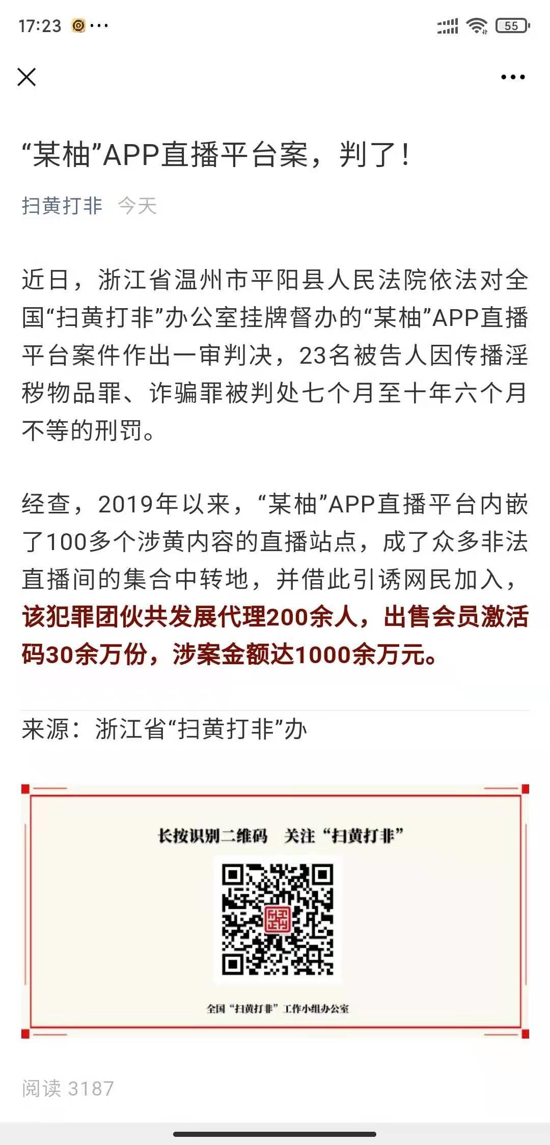 8日消息 据浙江省 “扫黄打非”办发布,近日,浙江省温州市平阳县人民法院依法对全国 “扫黄打非”办公室挂牌督办的 “某柚”App 直播平台案件作出一审判决,23 名被告人因传播淫秽物品罪、诈骗罪被判处七个月至十年六个月不等的刑罚。