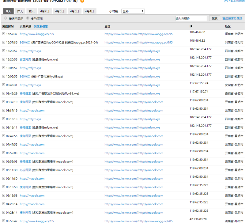 不知道是被攻击还是什么情况,网站访问明细都是一些无关紧要的内容,但是点进去之后还是正常跳转到网站首页,如图所示,哪位大神解释一下什么情况