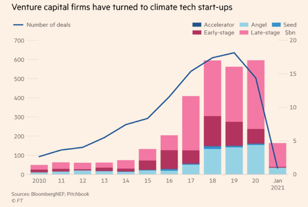 最近,逐渐受到青睐的 SPAC 为风投资本家退出他们投资项目提供了新的途径,也为想要提高融资规模以扩大生产的公司带来了新的资金选择。在过去一年中,40 家气候相关的公司通过与 SPAC 合并的方式上市,包括能源突破基金和科斯拉均有投资的电动汽车电池创业公司 QuantumScape。