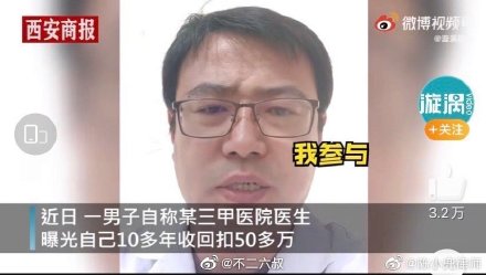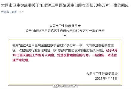 此前举报给院纪委不查 现多部门介入】4月11日,山西大同自曝从业十几年收受50多万回扣的医生丰某告诉@紧急呼叫,自己从2018年5月开始向医院纪委举报自己收回扣一事,医院纪委受理后却一直未给出处理结果,之后自己开始在网络平台发自曝视频。11日,#大同卫健委回应医生自曝收50万回扣#称,已派驻工作组介入调查。