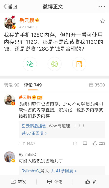 岳云鹏发博“我买的手机128G内存,但打开一看可使用内存只有112G,那是不是应该收我112G的钱,还是说收128G的钱是合理的? ???”,热评更笋了哈哈哈哈哈“可能人脸识别占地儿了”
