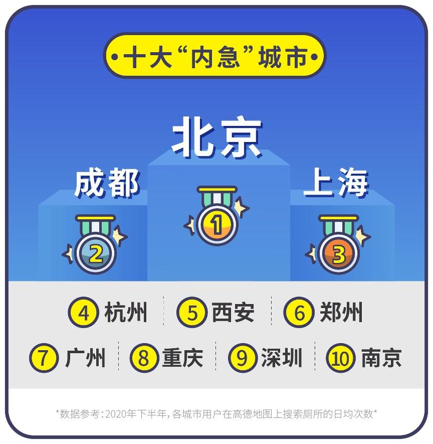 按照各城市用户在高德地图上搜索厕所的日均次数统计,北京、成都、上海、杭州、西安、郑州、广州、重庆、深圳、南京的厕所搜索次数最多,用户对公共厕所的需求最为旺盛 , 成为 “十大内急城市”。