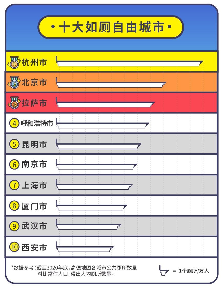 数据显示,国内厕所数字化程度最高的十大城市,依次是北京、上海、杭州、重庆、成都、广州、武汉、天津、南京、郑州,这些城市在高德地图上能够搜索到的厕所数量最多。