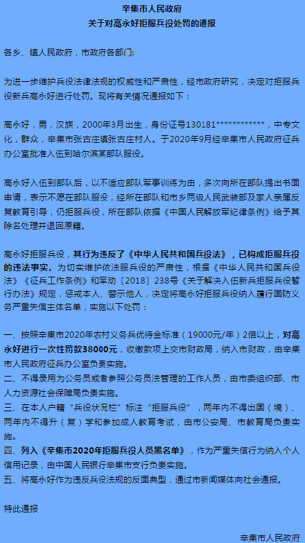 列入黑名单】 辛集市人民政府关于对高永好拒服兵役处罚的通报:高永好,男,汉族,2000年3月出生,身份证号130181************,中专文化,群众,辛集市张古庄镇张古庄村人。于2020年9月经辛集市人民政府征兵办公室批准入伍到哈尔滨某部队服役。高永好入伍到部队后,以不适应部队军事训练为由,多次向所在部队提出书面申请,表示不愿在部队服役,经所在部队和市乡两级人民武装部及家人亲属反复教育引导,仍拒服兵役,所在部队依据《中国人民解放军纪律条例》给予其除名处理并退回原籍。