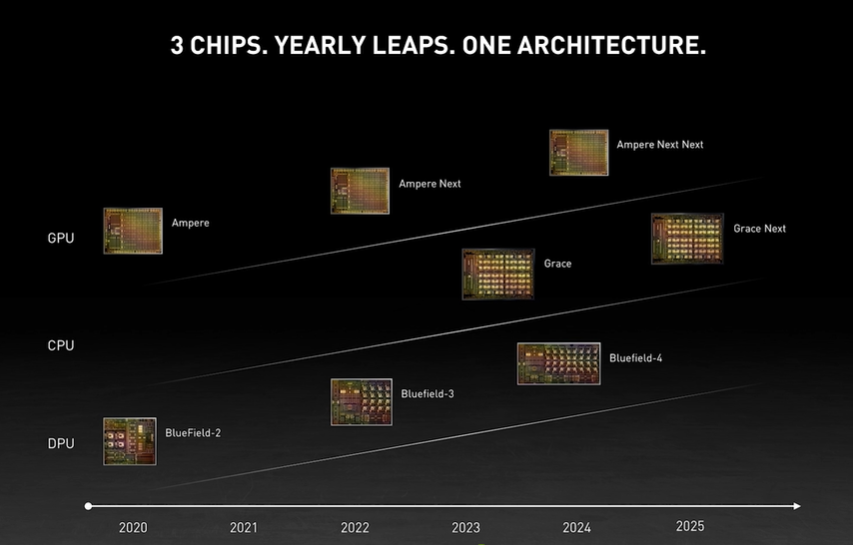 纵观整场发布会,英伟达真可谓是 AI 与智能驾驶齐飞,CPU 与 GPU 跨界。新时代的计算机需要新的芯片、新的系统架构、新的网络、新的软件和工具。英伟达全新的数据中心路线图已包括 CPU、GPU 和 DPU 三类芯片,将英伟达也将被重新定义为三芯片公司。