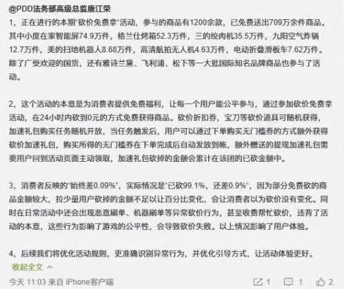 由于事件引起的关注度越来越高,拼多多法务部高级总监唐江荣很快作出回应,声称“砍价免费拿活动”不但包含1200余款商品,并且已经免费送出的商品就多达709万余件,至于消费者反映的“始终差0.09%”的情况并不符实,活动页面显示的内容应该是“已砍99.1%,还差0.9%”。至于为什么会有出现邀请好友砍价后却无法得到商品的情况,在回应的解释也很直白,声称是由于产品金额较大,如果用户邀请砍价的好友数量较少是无法在砍价金额百分比上产生明显的减少,因此可能会造成用户的误会。说白了,如果拉不够一定数量的好友帮忙砍价,就会导致最终参加活动失败。