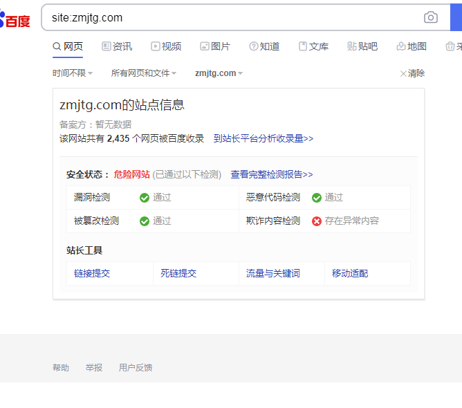 今天是建站第11天,最初没site:主域名,到前天才发现这些问题,昨天折腾一天想尽量救它。百度暂时判定还是危险站点,申诉信件已得到回复,重新给我了个新邮箱,把详细情况描述完昨晚又发给百度了,正在等回信,我看看多久能把站救过来,https://www.zmjtg.com/,不急不燥(其实是心急心燥...,10年没碰过网站了,刚回来就玩这)。