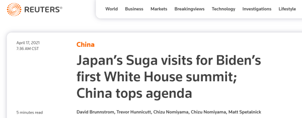 当地时间16日,美国总统拜登与访美的日本首相菅义伟举行了会晤,路透社称,“中国是首要议题”。