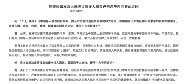 中国驻日使馆发言人17日也表示,日美领导人会谈和联合声明对中国进行无端指责,粗暴干涉中国内政,侵犯中方领土主权,中方对此表示强烈不满和坚决反对。中方已向日美双方提出严正交涉。