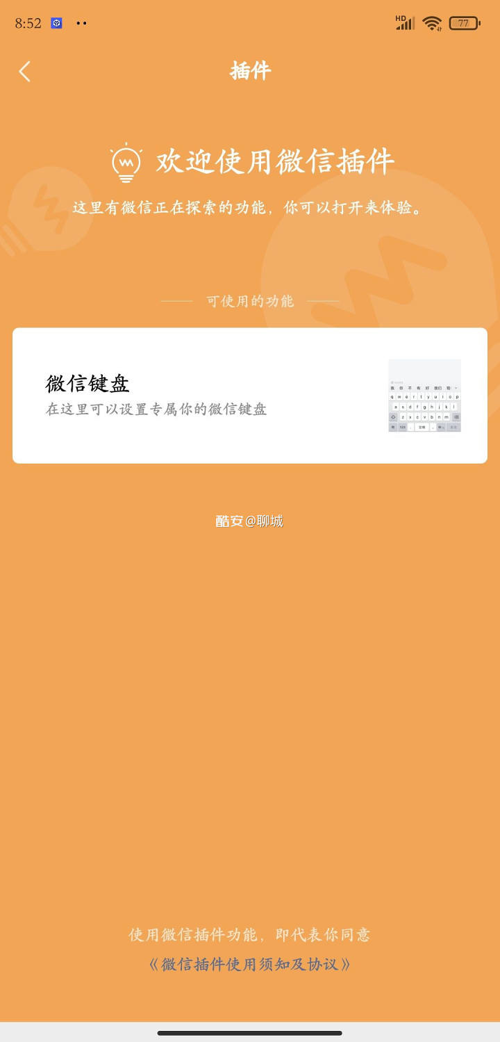 18 日消息 据酷安网友 @聊城 爆料,微信已开始内测“微信键盘”,获得内测资格的用户可在“我 —— 设置 —— 插件”中心查看并开启。