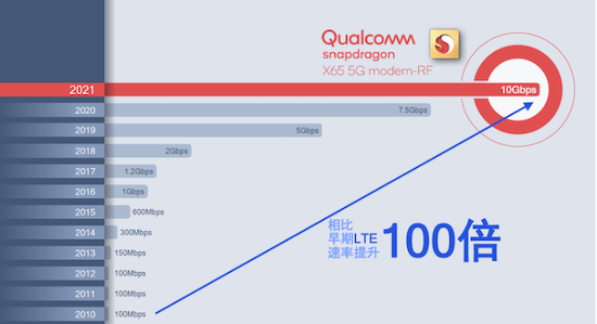 也正是因为载波聚合对于更多频段的支持,加之骁龙X65在下行链路带宽上的提升,在毫米波频段可高达1GHz,Sub-6GHz频段达300MHz,并可最终通过毫米波和Sub-6GHz频段的双连接,实现最高10Gbps的峰值速率,这一数值相比早期LTE速率提升了100倍,也终于兑现了业界在规划5G网络最初时所畅想的愿景。