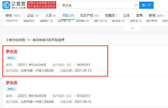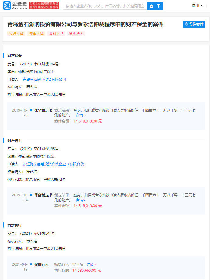 20 日消息 企查查 App 显示,青岛金石灏汭投资有限公司与罗永浩仲裁程序中的财产保全的案件于 4 月 19 日公布,被执行人为罗永浩,执行标的为 1458 万元,执行法院为北京市第一中级人民法院。