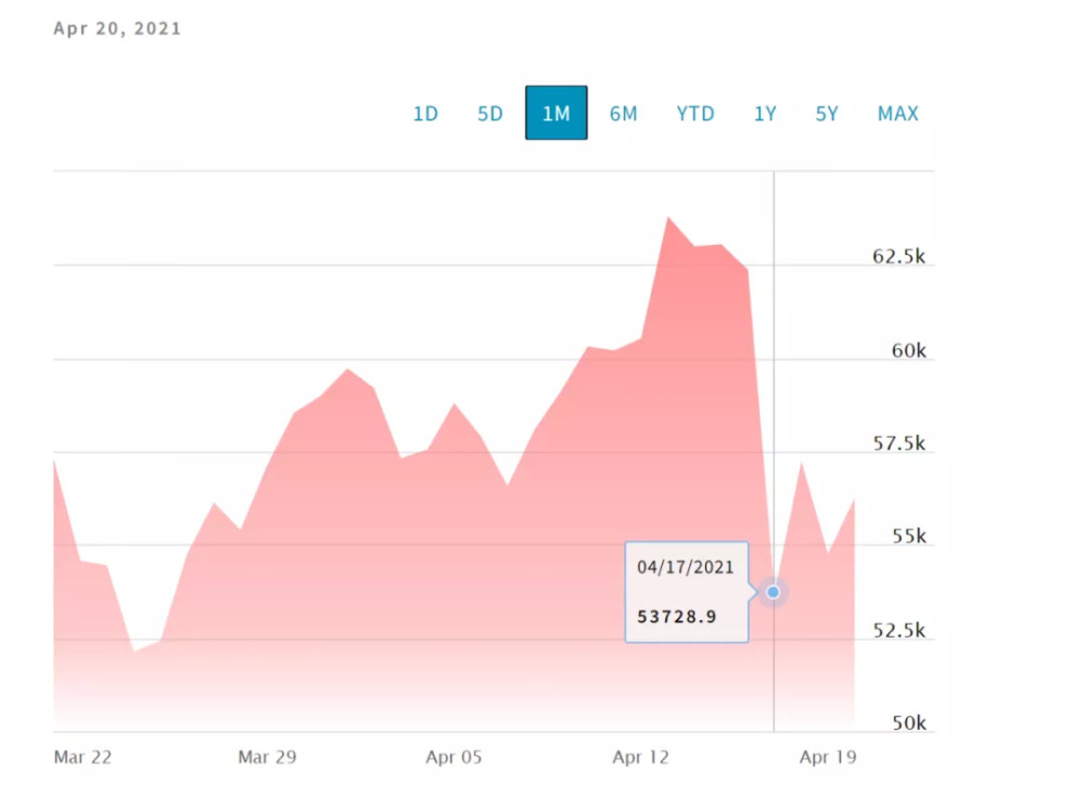 上个周末(4月17日-18日),比特币突然经历了闪电式崩盘,价格跌上热搜。目前,微博#比特币跌破52000美元#话题下共有1.5亿阅读,1.4万讨论。截至发稿,比特币价格为5.6万美元,仍未升回6万美元大关。