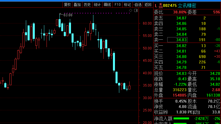 周三早盘,“果链一哥”立讯精密继续弱势调整。截至发稿报34.83元,跌1.22%,年内已下跌超37%。