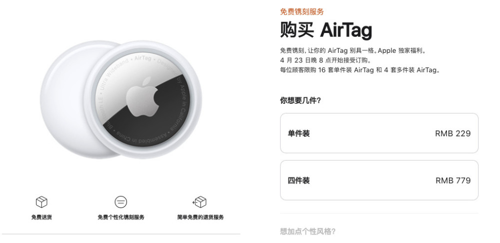 行货版的价格单只229元,四只的套装版779元,其中镭射镌刻是免费的。