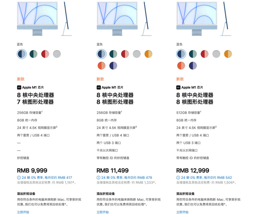 全新的24英寸iMac国内提供了三个版本,均采用M1处理器,不同在于内存和配件。