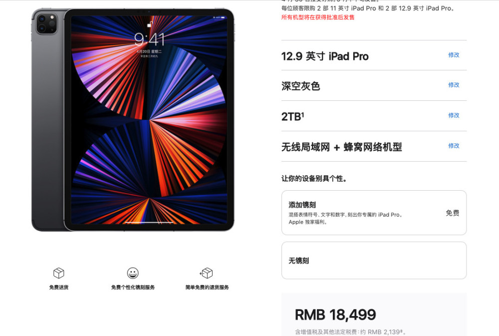 其中12.9英寸的iPad Pro起售价8499元,配备128GB存储空间,如果你选择2TB的容量,支持5G网络的版本,其价格高达18499元。