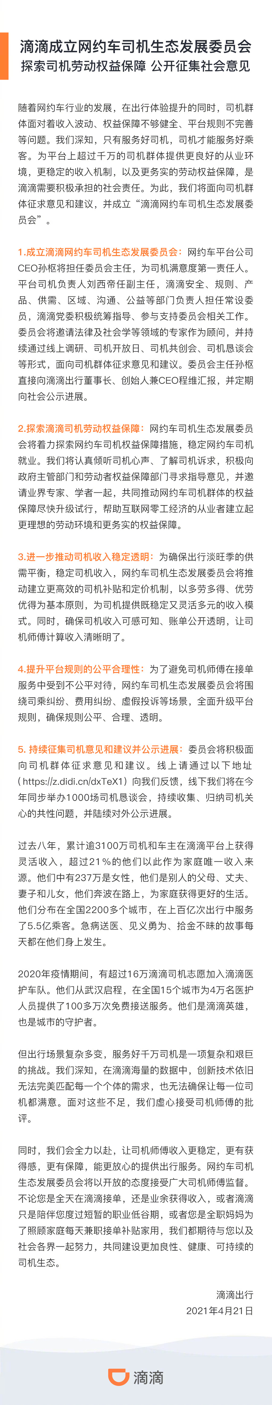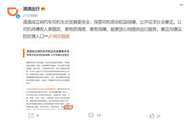 21 日消息 滴滴出行官方宣布,成立网约车司机生态发展委员会,探索司机劳动权益保障,公开征求社会意见。让司机师傅收入更稳定,更有获得感,更有保障,能更放心地提供出行服务。