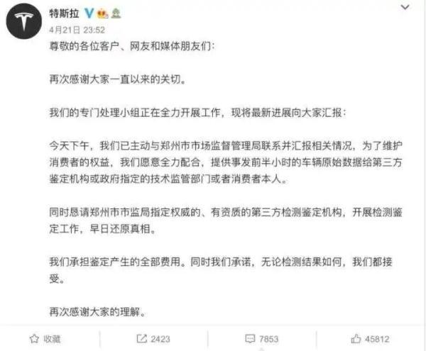 声明还称,恳请郑州市市监局指定权威的、有资质的第三方检测鉴定机构,开展检测鉴定工作,早日还原真相。特斯拉将承担鉴定产生的全部费用,并承诺,“无论检测结果如何,我们都接受”。