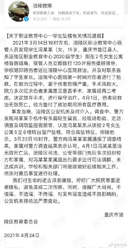 【#重庆一15岁女孩校内坠亡#,捐献的器官点亮4人生命,家属盼查清死因】重庆垫江人吴女士的女儿希希今年15岁,去年进入重庆市涪陵区职业教育中心读书,在学校寄宿。今年3月14日晚8时3分,在外地的吴女士突然接到电话,说希希在学校坠楼了,身受重伤。夫妻赶到医院时,希希已处于昏迷状态,最终于4月1日中午不幸离世。吴女士夫妻做出决定,将女儿的眼角膜、肾脏、肝脏捐献出来。目前,器官已经成功移植到4个病人身上。