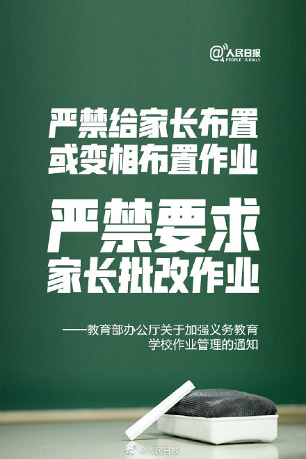 教育部办公厅发布关于加强义务教育学校作业管理的通知:不给家长布置作业。#严禁给家长布置或变相布置作业#,严禁要求家长批改作业。引导家长树立正确的教育观念,切实履行家庭教育主体责任,营造良好家庭育人氛围,合理安排孩子课余生活,与学校形成协同育人合力;督促孩子回家后主动完成学校布置的作业,引导孩子从事力所能及的家务劳动,激励孩子坚持进行感兴趣的体育锻炼和社会实践;不额外布置其他家庭作业。O网页链接
