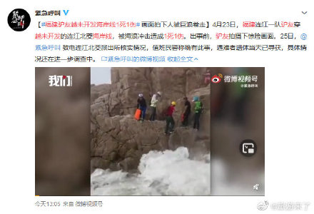 画面拍下人被巨浪卷走】4月23日,福建连江一队驴友穿越未开发的连江北茭海岸线,被海浪冲击造成1死1伤。出事前,驴友拍摄下惊险画面。25日,@紧急呼叫 致电连江北茭派出所核实情况,值班民警称确有此事,遇难者遗体当天已寻获,具体情况还在进一步调查中。