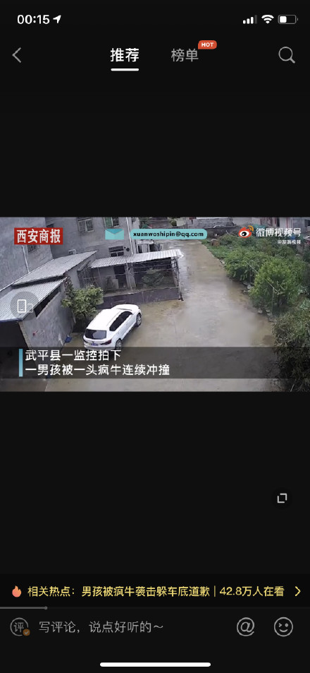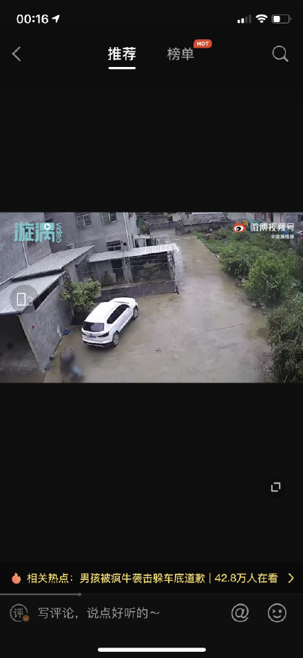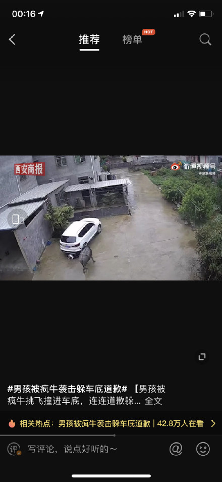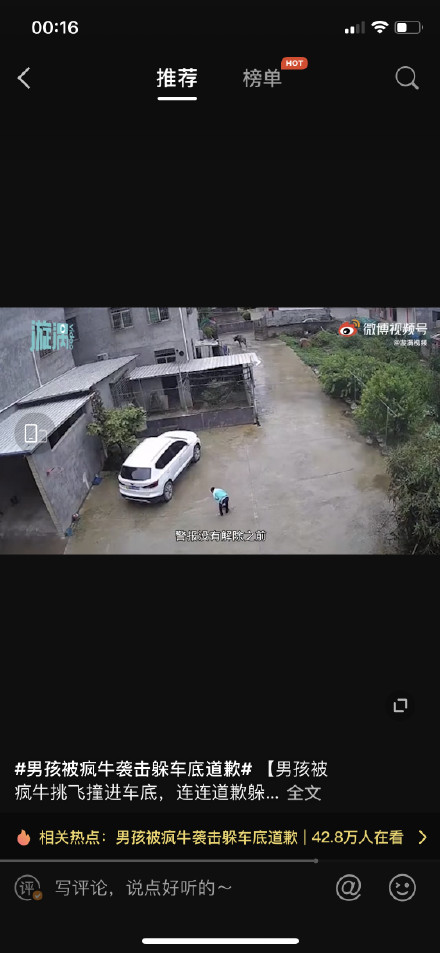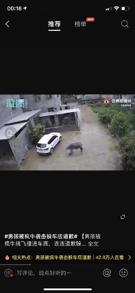 【男孩被疯牛挑飞撞进车底,连连道歉躲过一劫:对不起牛大哥别打我】4月25日 福建龙岩。武平县一头疯牛在街道乱窜时,袭击了一名男孩。男孩被疯牛挑飞恰好落进一辆车的车底。疯牛疯狂顶撞轿车发出巨大的响声,男孩在车底慌忙道歉求牛大哥别打自己。随后疯牛自行离去,男孩爬出车底后离开了现场。当地警方称,目前正在对疯牛实施抓捕,并提醒居民,在警报解除之前出门要格外小心。 L漩涡视频的微博视频