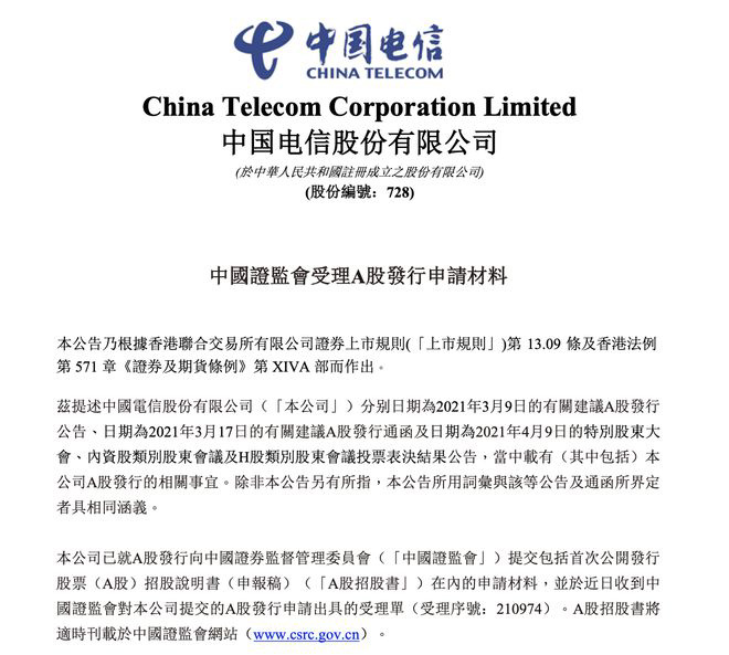 27 日晚间,中国电信在港交所公告,公司已就 A 股发行向中国证券监督管理委员会提交包括首次公开发行股票招股说明书在内的申请材料,并于近日收到中国证监会对本公司提交的 A 股发行申请出具的受理单。