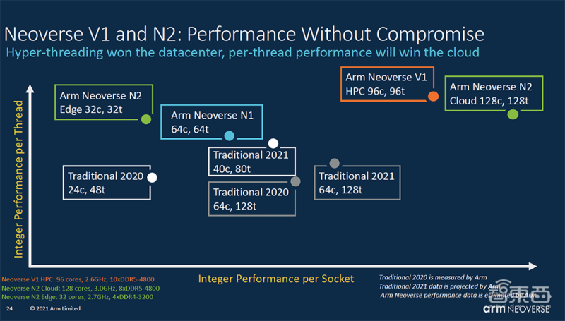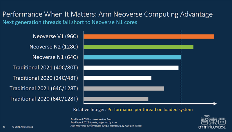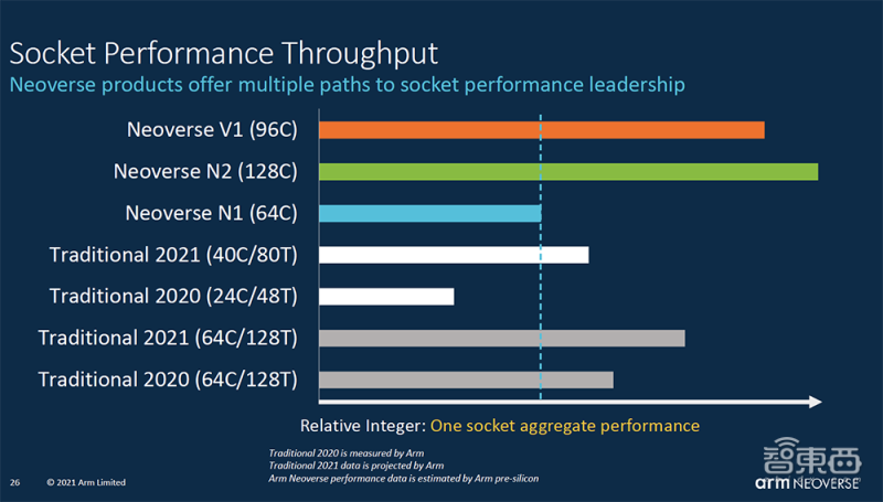 尽管 Arm 并未直接对比 Neoverse 平台与英特尔、AMD 产品的性能,但从图中可以看到,Neoverse 系列芯片已经非常有竞争力。