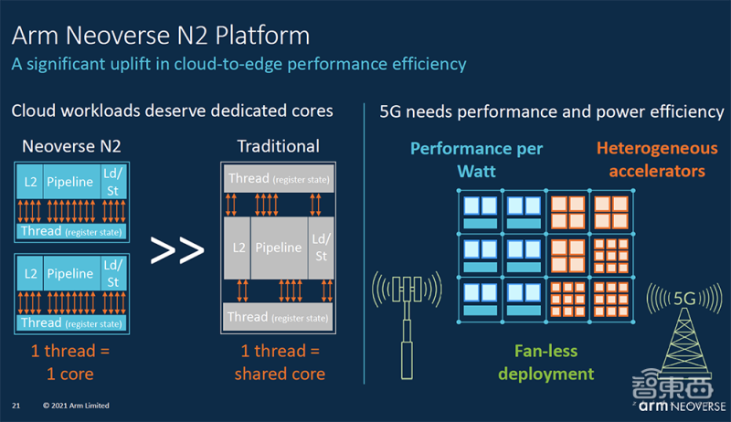 随后,2019 年,Neoverse N1 和 CMN-600 Mesh 网络将线性性能扩展到非常高的内核数量,更加适合云服务。据其分享,N1 单核性能已经比肩或超过传统 SMT 线程的性能。