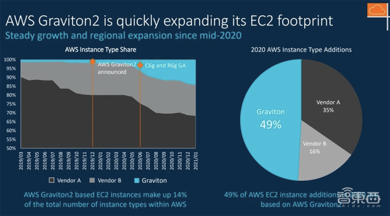 亚马逊云科技(AWS)通过收购 Annapurna Labs 部门成为 Arm Neoverse 的早期使用者,其自研服务器芯片 AWS Gravition 正快速布建于 AWS 的各个服务区域。而过去 AWS 推出的新实例中,有近一半是基于 Graviton2 平台的。