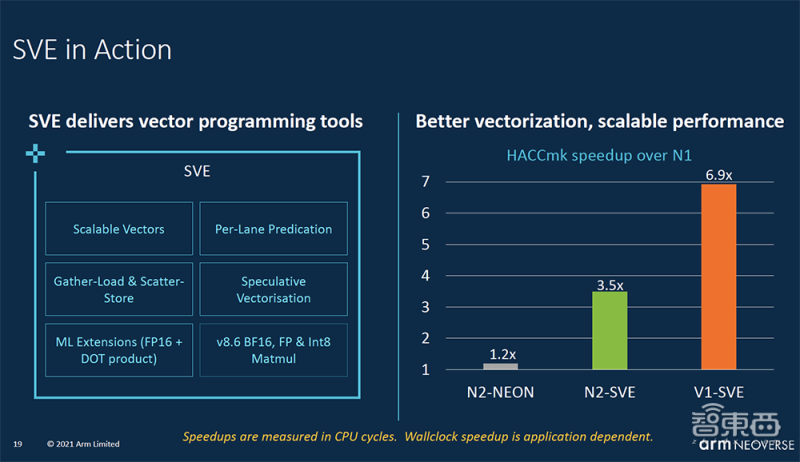 由于 SVE 与矢量长度无关,因此相同代码不加修改即可在 V1 上运行,如果在 V1 上加倍 SVE 矢量的宽度,对应处理速度也几乎提速 1 倍。