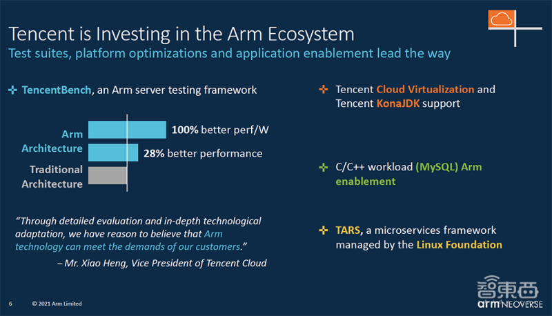 在云服务方面,腾讯与 Arm 持续合作,腾讯在硬件测试和软件支持方面持续投入,使其在云应用上能采用 Arm Neoverse 技术,每瓦性能表现出色,软件部分既支持已编译和解译的代码库,也支持为这些代码库提供支撑的微服务框架。