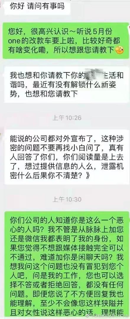 4月27日晚,理想汽车CEO李想在微博发文称,有女性记者向企业男性员工打探消息,而男性员工用了非常不恰当的带有侮辱女性的比喻方式进行了回复,该男性员工在试用期被解雇,企业和媒体对接的负责人也当面对女记者进行道歉。